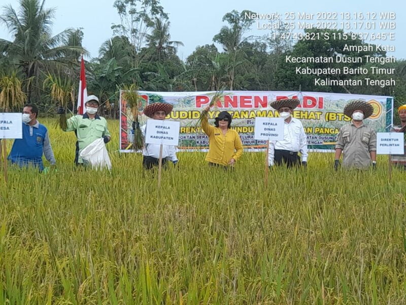 BARITO TIMUR, Kaltengtimes.co.id – Kepala Dinas TPHT Provinsi Kalimantan Tengah, Riza Rahmadi mengatakan, program Budidaya Tanaman Sehat di atas 100 hektar lahan masyarakat di Kabupaten Barito Timur merupakan program yang terus dikembangkan, agar kedepan dalam hal produksi padi, tiga aspek terpenuhi, yaitu produksi yang tinggi, aman dan sehat dari segi kesehatan, dan ramah lingkungan. Hal tersbeut dikatakan Riza Rahmadi disela panen padi Budidaya Tanaman Sehat (BTS) variates inpari 30 di Kecamatan Dusun Tengah, Kabupaten Barito Timur, Jumat (25/3). Panen padi tersebut dilakukan Direktur Perlindungan Tanaman Direktorat Jenderal (Ditjen) Tanaman Pangan Kementan RI Takdir Mulyadi.