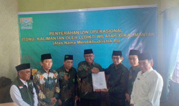 Palangka Raya, kaltengtimes.co.id– Ketua Pengurus Wilayah Nahdatul Ulama (PW-NU) Kalimantan Tengah HM Wahyudi F Dirun bersama jajaran PW NU Kalteng dan lembaga pendidikan NU menerima izin operasional Institut Teknologi dan Sains Nahdatul Ulama (ITSNU) Kalimantan yang diserahkan langsung oleh Ketua LLDIKTI wilayah XI Kalimantan DR Drs Muhammad Akbar mewakili Mendikbudristek RI. Acara penyerahan berlangsung di Pusat Pendidikan (Pusdik) NU Jalan RTA Milono, Palangka Raya, Senin (28/3).