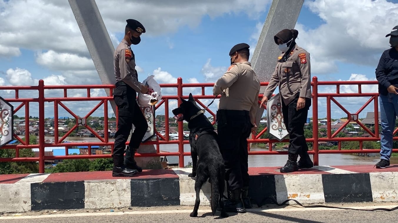 Petugas saat mengerahkan anjing Pelacak untuk mencari orang hilang di Jembatan Kahayan. (Ist)