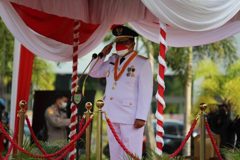 PALANGKA RAYA-Kaltengtimes.co.id – Upacara penurunan Sang Saka Merah Putih, Selasa 17 Agustus 2021, yang dilaksanakan di Halaman Kantor Gubernur Provinsi Kalimantan Tengah, berlangsung, aman, tertib dan khidmat. Bertindak selaku Inspektur Upacara, Wakil Gubernur Kalimantan Tengah, H.Edy Pratowo, sedangkan Komandan Upacara dipimpin Kabagdalops Biro Operasi Polda Kalteng, AKBP Heri Kiswanto. Upacara yang dihadiri unsur TNI-Polri dan Aparatusr Sipil Negara di lingkingan Pemprov.Kalteng tersebut dimulai dengan laporan Komandan Upacara kepada Inspektur Upacara. Kemudian, Paskibraka Pasukan Pengibar Bendera Pusaka (Paskibraka) dari beberapa Kabupaten/Kota di Kalteng bertugas menurunkan Sang Merah Putih. Rangkaian Upacara dilanjutkan dengan Andhika Bhayangkari, yang selanjutnya Laporan Komandan Upacara dan terakhir Penghormatan Pasukan. Penurunan Bendera sore hari dilakukan oleh 3 orang Pasukan Paskibraka dari beberapa Kabupaten/Kota di Kalteng yakni Ayonia, Goldi Roger dan Leo Ade. Upacara Penurunan Bendera Merah Putih dilaksanakan dengan menerapkan protokol kesehatan secara ketat tanpa mengurangi rasa khidmat. Terlihat Wagub beserta pejabat Pemprov dan Unsur Forkopimda yang hadir mengenakan masker. Upacara Penurunan Bendera menjadi penutup rangkaian perayaan Peringatan Hari Ulang Tahun ke-76 RI. Hadir mengikuti Upacara Penurunan Bendera diantaranya Kapolda Kalteng Irjen Pol. Dedi Prasetyo, Danrem 102/Pjg Brigjen TNI Purwo Sudaryanto, Kepala Kantor Wilayah Kemenkumham Kalteng Ilham Djaya, Unsur Forkopimda, sejumlah Kepala Perangkat Daerah Prov. Kalteng, serta para tamu undangan lainnya. (red)