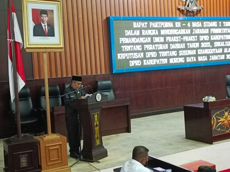 PURUK CAHU, kaltengtimes.co.id– Wakil Bupati Kabupaten Murung Raya (Mura) Rejikinoor menyampaikan jawaban dan penjelasan dari pemerintah daerah terhadap pandangan umum yang disampaikan oleh fraksi- fraksi DPRD Murung Raya terhadap 6 buah usulan Rancangan Peraturan Daerah (Raperda) tahun 2022.