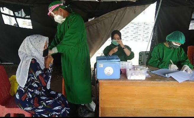 Dalam pelaksanaannya, semua peserta wajib menerapkan protokol kesehatan dengan mencuci tangan, memakai masker dan diperiksa suhu tubuhnya, kemudian dilakukan skrining, apabila peserta lolos skrining selanjutnya peserta di beri vaksin.
