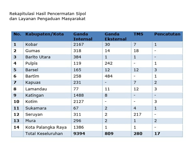 Kemudian Bawaslu Kabupaten/Kota se-Provinsi Kalimantan Tengah telah menerima pengaduan masyarakat terkait pencatutan sebagai anggota partai politik dan telah menyampaikan saran perbaikan kepada KPU Kabupaten/Kota. red
