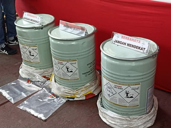 Dari tempat itu petugas berhasil menyita beberapa barang bukti berupa bahan kimia tanpa ijin dan berbahaya Jenis Sodium Cyanide atau Sianida sebanyak 27 kaleng seberat 1,35 Ton. Kemudian akan dijual kembali di daerah Murung Raya.