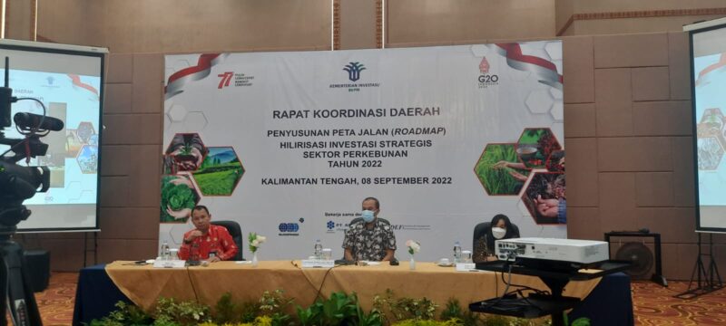 PALANGKA RAYA. Kaltengtimes.co.id — Mewakili Asisten Bidang Perekonomian dan Pembangunan Setda Provinsi Kalimantan Tengah, Kepala Dinas Penanaman Modal dan Pelayanan Terpadu Satu Pintu (DPMPTSP) Provinsi Kalimantan Tengah, Sutoyo memberikan Sambutan pada kegiatan Rapat Koordinasi Daerah (Rakorda) Penyusunan Peta Jalan (road map) Hilirisasi Investasi Strategis Sektor Perkebunan Tahun Anggaran 2022. Rakorda ini merupakan kegiatan yang dilaksanakan oleh Kementerian Investasi/BKPM bekerja sama dengan KSO Sucofindo – Indef – Amythas yang berlangsung di Seruyan Grand Ballroom M Bahalap Hotel Kota Palangka Raya, Kamis (8/9).