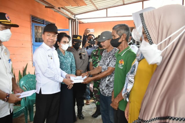 Bupati Kapuas dan ketua TP PKK saat memberikan santunan korban kebakaran. (Ist)