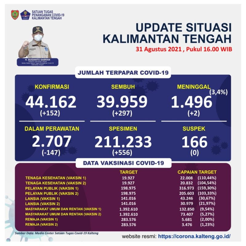 PALANGKA RAYA. Kaltengtimes.co.id — Berdasarkan laporan Tim Satuan Tugas Penanganan Covid-19, kasus terkonfirmasi positif covid-19 di Kalimantan Tengah terus bertambah. Dilaporkan jumlah akumulasi data pada hari Selasa tanggal 31 Agustus 2021, pasien terkonfirmasi positif covid-19 di Kalimantan Tengah bertambah sebanyak 152 orang. Dalam press realise yang disampaikan Diskominfosantik Kalimantan Tengah menyebutkan, meski jumlah kasus terkonfirmasi positif covid-19 di Kalimantan Tengah bertambah menjadi 152 orang dengan total kasus 144.162 orang, namun pada hari Selasa, 31 Agustus 2021 jumlah pasien yang dinyatakan sembuh juga bertambah sebanyak 297 orang dengan total kasus mencapai 139.959 orang. Data ini menunjukkan bahwa sejak tanggal 12 maret 2020 dimana kasus pertama kali yang terkonfirmasi positif covid-19 sampai dengan saat ini, penambahan kasus konfirmasi baru selalu terjadi setiap hari di Kalimantan Tengah. Hal ini berpotensi terus terjadi jika masyarakat tidak disiplin menerapkan protokol kesehatan dalam aktivitas sehari-hari. Oleh karena itu Tim Satuan Tugas Penanganan Covid-19 Kalimantan Tengah mengharapkan kepada seluruh masyarakat Kalimantan Tengah melihat kenyataan penyebaran covid-19 dan tidak ada lagi yang berpikir bahwa ini merupakan sebuah konspirasi dan meminta dukungan seluruh elemen masyarakat untuk terus mensosialisasikan ancaman covid-19 dengan menerapkan disiplin protokol kesehatan. Dalam laporan Tim Satgas disebutkan, perkembangan data covid-19 yang dihimpun akumulasinya pada hari Selasa Tanggal 31 Agustus 2021 pukul 15.00 WIB sebagai berikut, dari bertambahnya kasus terkonfirmasi positif covid-29 sebanyak 150 orang tersebut yaitu di Kota Palangka Raya sebanyak 25 orang, Katingan 8 orang, Kotim 27 orang, Kobar 8 orang dan Kabupaten Lamandau sebanyak 3 orang. Selanjutnya untuk Kabupaten Sukamara sebanyak 3 orang, Seruyan 4 orang, Pulpis 5 orang, Kapuas 21 orang, Gunung Mas 8 orang, Barsel 5 orang, Bartim 8 orang, Barut 21 orang dan Kabupaten Murung Raya sebanyak 6 orang, sehingga dari semula sebanyak 44.010 orang menjadi 44.162 orang. (red)