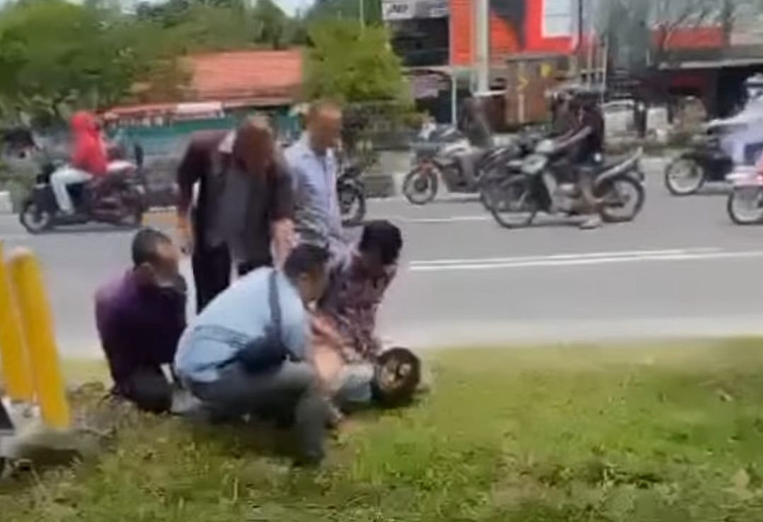 Tiba-tiba terjadi keributan disekitaran lokasi hingga ketengah jalan. petugas pun langsung bergegas ke TKP dan berusaha mengamankan pelaku. Ketika hendak diringkus pelaku berusaha melarikan diri hingga ketengah jalan.