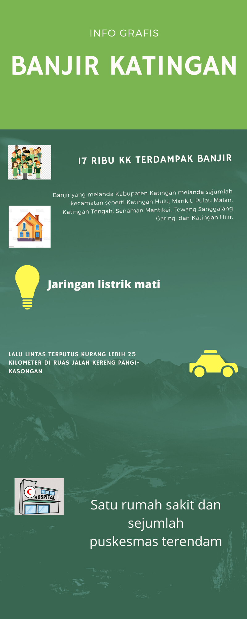 Banjir tak hanya merendam puluhan ribu rumah warga, fasilitas publik, namun juga menyebabkan jalan-jalan putus, pasar terendam, listrik mati, serta rumah sakit ikut terendam. Banjir juga memaksa warga mengungsi ke tempat – tempat pengungsian.
