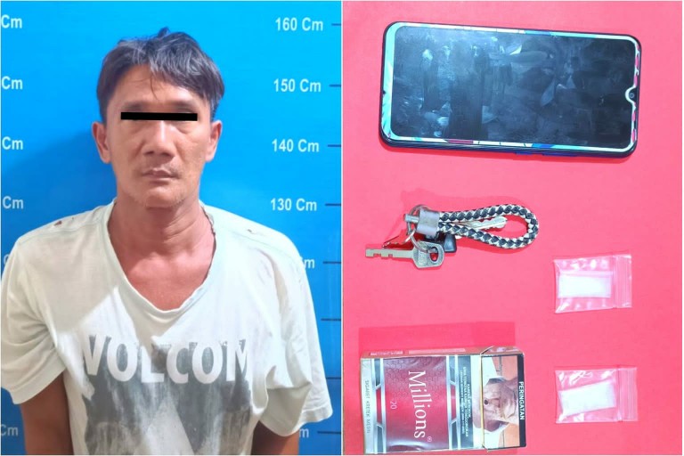 Hasil penggeledahan ditemukan 2 paket seberat 1,29 gram narkotika jenis sabu yang disimpan di dalam kotak rokok Millions berada di genggaman tangan kiri pelaku.