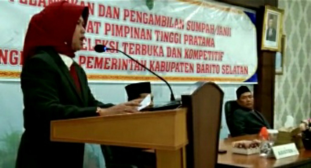 BUNTOK, kaltengtimes.co.id. Penjabat (Pj) Bupati Barito Selatan (Barsel) Lisda Arriyana melantik dan mengambil Sumpah Pejabat Pimpinan Tinggi Pratama Kabupaten Barito Selatan, di aula Sekretariat Daerah Kab. Barsel, Rabu (11/01/2023).