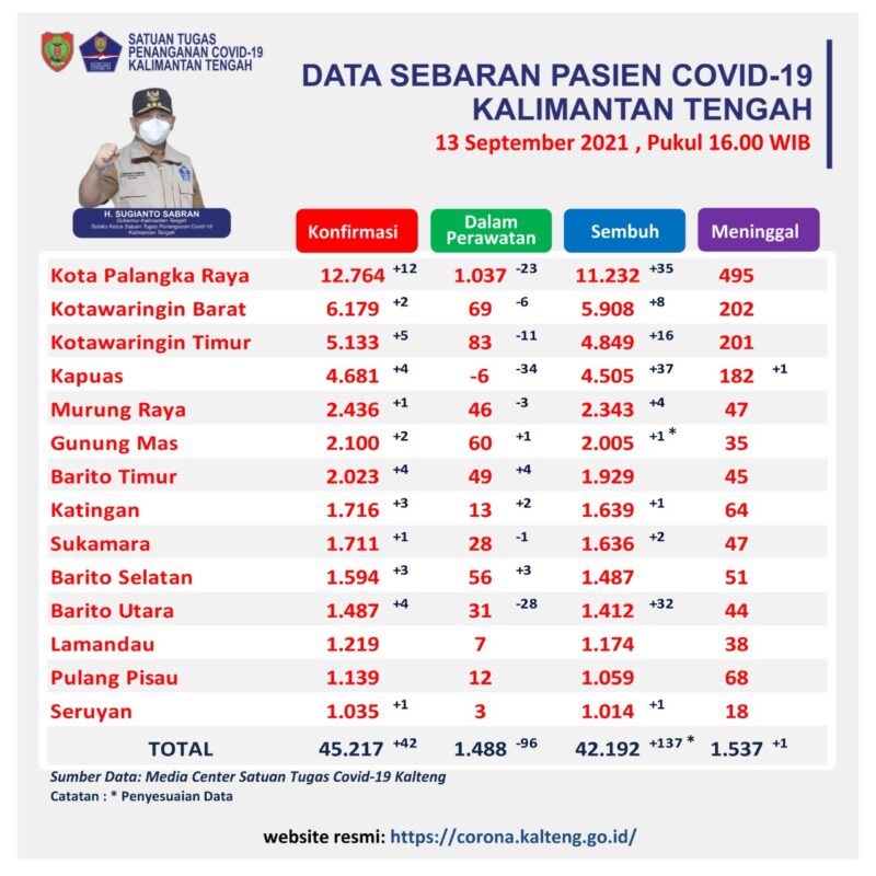 PALANGKA RAYA. Kaltengtimes.co.id – Berdasarkan laporan Tim Satuan Tugas Penanganan Covid-19 Kalimantan Tengah, jumlah akumulasi data sampai dengan hari ini Senin, 13 September 2021, pasien konfirmasi positif Covid-19 di Kalimantan Tengah bertambah sebanyak 42 orang dengan total kasus mencapai 45.217 orang. Penambahan pasien dinyatakan sembuh sebanyak 137 orang dengan total kasus mencapai 42.192 orang.