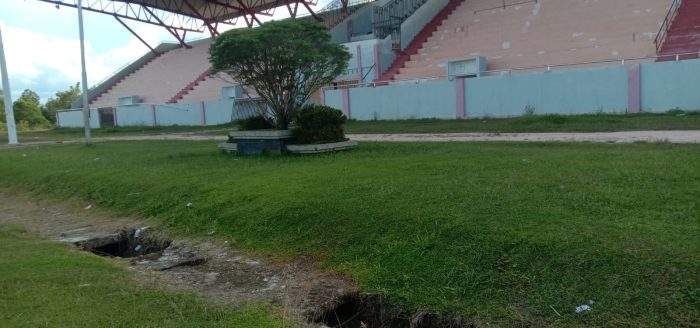 KASONGAN, kaltengtimes.co.id- Saluran air di sekeliling lapangan sepak bola yang ada di Sport Center – Kasongan saat ini banyak lubangnya. Lubang tersebut sebelumnya ada tutupnya. Mungkin tutupnya itulah yang rusak. Sehingga berlubang di beberapa sisi dan sudut lapangan sepak bola tersebut berlubang.
