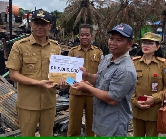 PURUK CAHU, kaltengtimes co id -Bupati Murung Raya, Kalimantan Tengan, Perdie M. Yoseph menyerahkan bantuan berupa uang tunai senilai Rp 60 juta kepada korban kebakaran di Desa Mangkahui Kecamatan Murung Kabupaten Murung Raya, Senin (10/4).