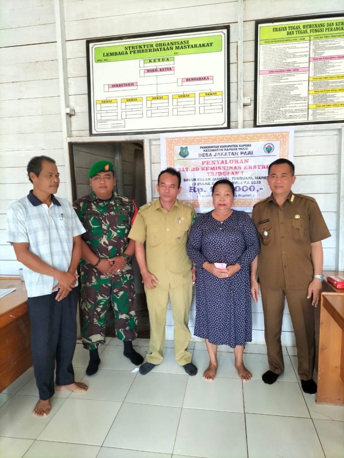KUALA KAPUAS, kaltengtimes.co.id-Sebagaimana program pemerintah dalam membantu masyarakat kurang mampu sehingga turut serta dalam mencegah penyebaran Covid-19 sehingga tidak berkembang, Pemerintahan Desa Jakatan Pari Kecamatan Kapuas salurkan Bantuan Langsung Tunai (BLT) yang dialokasikan dari Dana Desa (DD) tahun 2023 pada 75 Keluarga Penerima Manfaat (KPM).