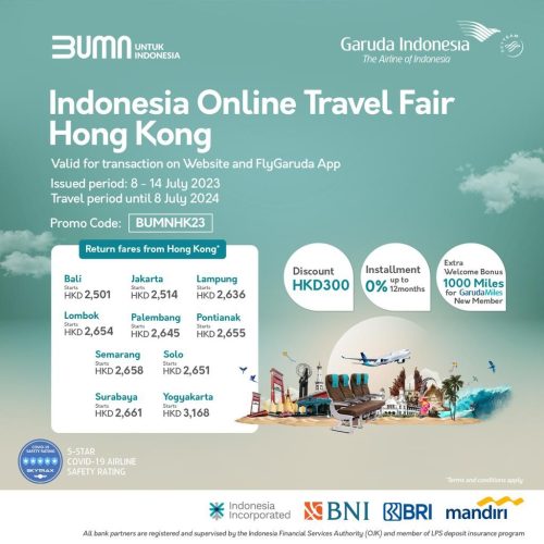 HONG KONG. Kaltengtimes.co.id — Maskapai nasional Garuda Indonesia menghadirkan promo diskon tiket penerbangan untuk keberangkatan dari Hong Kong sampai dengan 10 persen yang bertajuk Indonesia Online Travel Hong Kong,dan akan berlangsung mulai tanggal 8 – 14 Juli 2023 dengan menggandeng sejumlah bank partner yaitu Bank Mandiri, BNI, dan BRI dalam rangka memberikan manfaat ekstra berupa kesempatan mendapatkan cashback untuk periode perjalanan sampai dengan 8 Juli 2024.