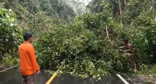 Petugas dibantu warga melakukan penanganan darurat khususnya untuk pembersihan material longsor dan pohon tumbang di Kabupaten Bolaang Mongondow Timur, Senin (10/7). (Photo/ist)