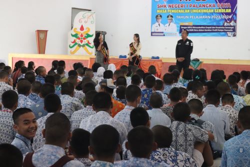 PALANGKA RAYA, kaltengtimes.co.id-Sebanyak 458 siswa baru yang sedang mengikuti kegiatan Masa Pengenalan Lingkungan Sekolah (MPLS) di SMKN 1 Palangka Raya mendapatkan pembekalan dari Bidang Humas Polda Kalteng terkait bijak bermedia sosial dan stop bullying, Kamis (13/7).
