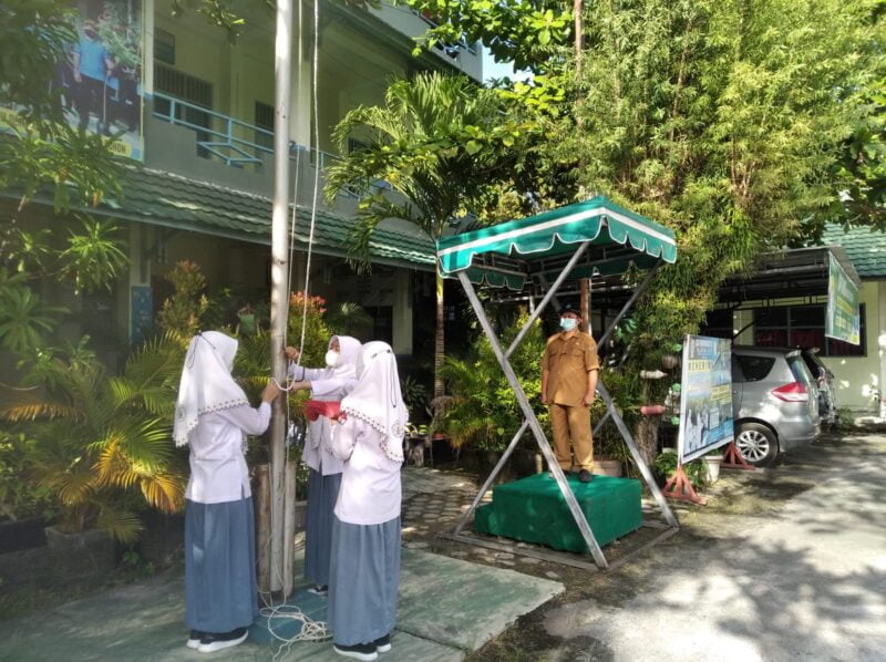 PALANGKA RAYA. Kaltengtimes.co.id – Untuk menyambut Pembelajaran Tatap Muka Terbatas (PTMT), SMA Muhammadiyah 1 Palangka Raya melaksanakan simulai upacara bendera, bertempat di sekolah setempat, Senin (27/9). Bertindak sebagai Pembina Upacara, Ahmad Wahyu Cahyono, Kepala SMA 1 Palangka Raya dan diikuti Wakil Kepala Sekolah, Anggota Satgas Covid 19, Guru Piket dan sebagian perwakilan siswa yang ditunjuk dan Pengurus IPM setingkat Osis. Dalam amanatnya, Ahmad Wahyu Cahyono, mengingatkan kembali pelaksanaan PTMT yang akan serentak dilaksanakan untuk tingkat SLTA di bulan Oktober, menyesuaikan kondisi penyebaran dan pencegahan Covid 19 didaerah masing-masing, sehingga perlunya disiplin diri dalam dan tetap menerapkan protokol kesehatan secara ketat. Para siswa juga dipersiapkan menghadapi Ujian atau Assesmen Nasional yang dilaksanakan mulai tanggal 27 – 30 September 2021, sesuai sesi yang dipilih sekolah. Assesmen ini diperuntukkan bagi 50 peserta didik di Kelas XI yang dipilih acak oleh Pusmenjar dan survey lingkungan untuk semua guru dan pejabat sekolah guna mengetahui potret sekolah.