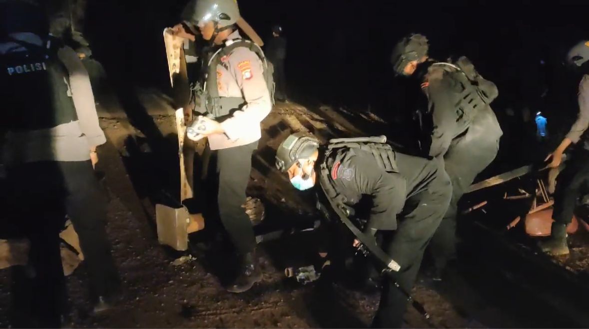 PALANGKA RAYA, kaltengtimes.co.id – Tim gabungan yang terdiri dari personel Satbrimob Polda Kalteng, Ditsamapta dan Polres Seruyan, membersihkan portal yang dibuat oleh oknum masyarakat dari tumpukan ranting dan pohon, di sekitar lokasi PT Hamparan Massawit Bangun Persada (HMBP), Sabtu, 23 September 2023 malam.