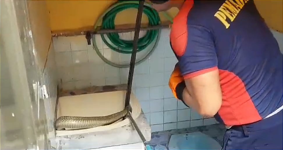 Dengan menggunakan alat penangkap ular, sarung tangan, dan sepatu lars, petugas berhasil menemukan ular kobra yang sempat bersembunyi di tempat penampungan air.