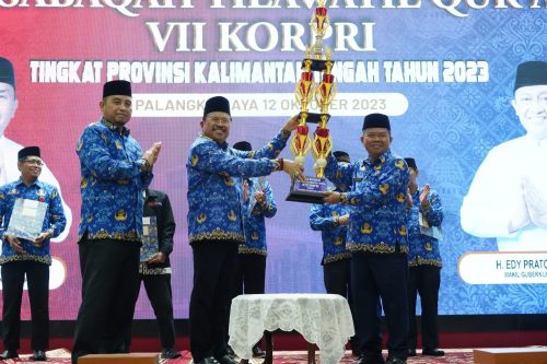 PALANGKA RAYA. Kaltengtimes.co.id – Sekretaris Daerah Provinsi Kalimantan Tengah H. Nuryakin menutup secara resmi pelaksanaan Musabaqah Tilawatil Qur’an (MTQ) VII KORPRI Tingkat Provinsi Kalimantan Tengah Tahun 2023, bertempat di Aula Jayang Tingang, Kantor Gubernur Kaltang, Kamis (12/10/23) malam. Dalam lomba MTQ VII tahun 2023 ini, sebagai juara umum daerah, Terbaik I dengan nilai 96 diraih oleh Kabupaten Kotawaringin Barat, Terbaik II nilai 81 diraih Kabupaten Barito Selatan, Terbaik III nilai 75 oleh Kabupaten Kotawaringin Timur, Terbaik IV nilai 67 diraih Kota Palangka Raya, Terbaik V nilai 64 oleh Kabupaten Barito Timur, dan Terbaik VI diraih oleh Kabupaten Pulang Pisau.