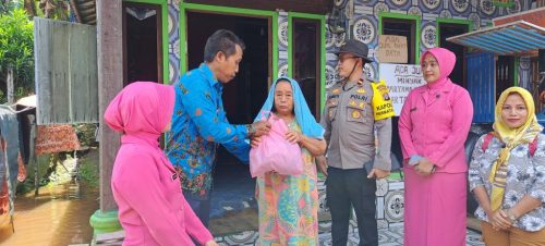 Mewakili Camat Permata Intan Dommy Joan Eka Dinata dan Lurah Tumbang Lahung Guntur, Kasi Kessos Kantor Kecamatan Permatan Intan Budi Sarwono tampak turun langsung menyerahkan sembako yang isinya terdiri dari beras, kopi, gula, dan mie instan kepada warga yang rumahnya terkena banjir.