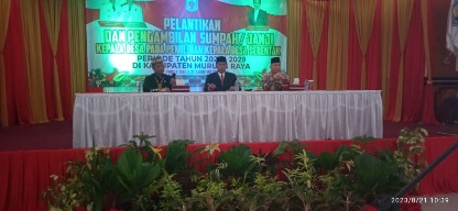 Sebanyak 34 orang kepala desa di Kabupaten Murung Raya (Mura) hasil dari pemilihan kepala desa serentak beberapa waktu yang lalu, kini mengikuti pengambilan sumpah dan janji jabatannya yang digelar di GPU Tira Tangka Balang, Senin (21/8/2023).