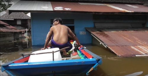 Seorang warga tampak menyelamatkan barang perabotan rumahnya menggunakan perahu. (Photo/rosa)