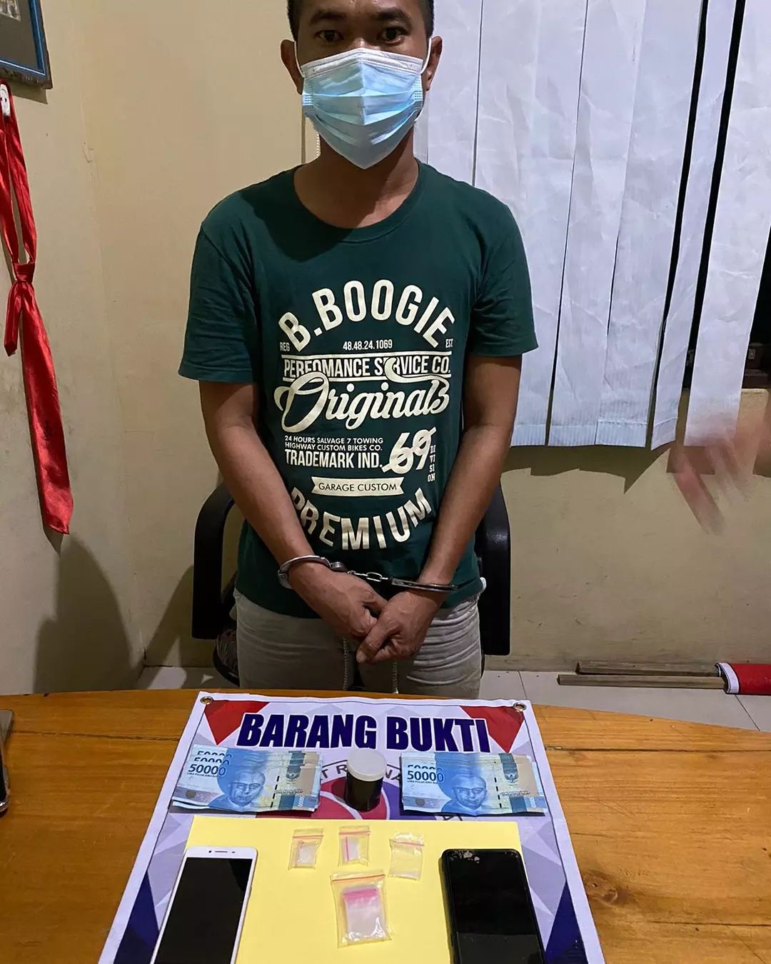 “Barang bukti yang kita amankan berupa Narkoba jenis sabu dengan berat kotor 2,81gram, satu buah botol kecil warna hitam putih, satu gawai merk oppo warna gold, satu gawai merk samsung warna hitam dan uang sebanyak Rp 1 juta,”ujarnya.