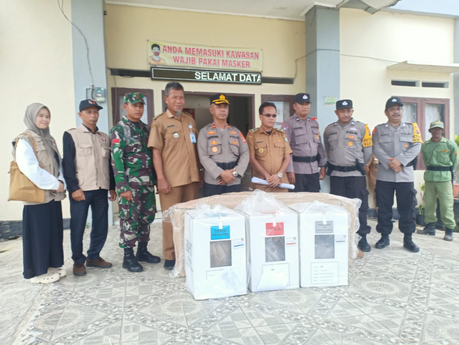 Penyerahan kotak suara dilakukan unsur muspika, panwaslu, kepada kepala desa ( Kades) yang mewakili sebagai penerima logistik tersebut.