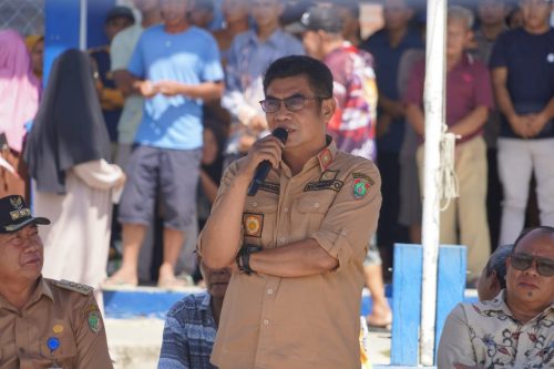 Kadiskominfosantik saat menyampaikan sambutan di halaman Kantor Camat Lahei.(Photo/rizaldi)