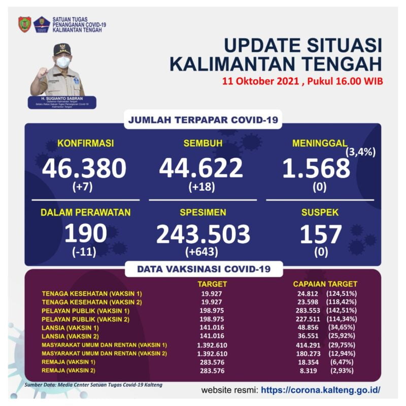 PALANGKA RAYA. Kaltengtimes.co.id – Kasus konfirmasi positif Covid-19 di Kalimantan Tengah pada hari Senin Tanggal 11 Oktober 2021 menurun drastis. Berdasarkan laporan Tim Gugus Tugas Covid-19 Kalimantan Tengah, pada Hari Senin, 11 Oktober, Pukul 16.00 WIB, kasus konfirmasi positif di Kalimantan Tengah hanya 7 orang. Rinciannya adalah untuk Palangka Raya 1 orang, Katingan 0, Kotim 0, Kobar 2 orang, Lamandau 0, Sukamara 0, Seruyan 0, Pulang Pisau 1 orang, Kapuas 1 orang, Gunung Mas 1 orang, Barito Selatan 1 orang, Barito Timur 0, Barito Utara 0 dan Kabupaten 0, sehingga angka kumulatif menjadi 46.380 orang. Dalam laporan tersebut juga disebutkan data pasien sembuh sebanyak 18 orang, dengan rincian di Palangka Raya sebanyak 6 orang, Katingan 2 orang, Kotawaringin Timur 0, Kotawaringin Barat 1, Kapuas 3 orang, Gunung Mas 3 orang, Barito Selatan 3 orang dan Lamandau, Sukamara, Seruyan, Barito Timur, Barito Utara dan Kabupaten Murung masing-masing 0 sehingga angka kumulatif menjadi 44.622 orang. Sedangkan data pasien meninggal dari 14 Kabupaten/Kota se Kalimantan Tengah pada hari Senin, 11 Oktober 2021 dilaporkan tidak ada pasien yang meninggal atau 0 sehingga data akumulatif tetap sebanyak 1.568. (red)