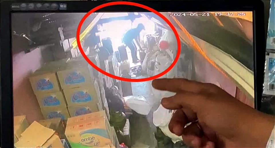 Dengan santainya terlihat pelaku tampak seorang pria ini dengan ciri-ciri menggunakan helm serta berpakaian serba hitam, masuk ke dalam gudang yang bersebelahan dengan toko sembako milik korban.