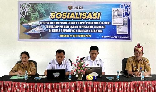 SERUYAN. Kaltengtimes.co.id — Seruyan – Dalam rangka memberikan informasi dan edukasi pentingnya para pelaku usaha perikanan terutama nelayan agar tertib administrasi untuk mendaftarkan kapalnya, Pemerintah Provinsi Kalimantan Tengah melalui Dinas Kelautan dan Perikanan (Dislutkan) Prov. Kalteng menyelenggarakan Sosialisasi Perizinan dan Pendaftaran Kapal Perikanan (E-BKP) Terhadap Pelaku Usaha Perikanan Tangkap di Kuala Pembuang, Kabupaten Seruyan, Selasa (25/6/24).