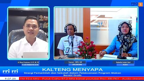 Palangka Raya. Kaltengtimes.co.id – Dalam rangka mendukung program Makan Bergizi Gratis (MBG) yang digagas Presiden RI Prabowo Subianto dan Wapres Gibran Rakabuming Raka, Pemerintah Provinsi Kalimantan Tengah telah mempersiapkan berbagai inovasi dan sinergi lintas sektor. Hal tersbeut diungkapkan Gubernur Kalteng H. Sugianto Sabran melalui Plt. Kepala Dinas Pendidikan Prov. Kalteng Muhammad Reza Prabowo saat menjadi narasumber dalam program Kalteng Menyapa, yang disiarkan langsung melalui Zoom dan kanal YouTube RRI Kalteng, Rabu (22/1/2025). Acara tersebut dipandu oleh presenter Sabella Indah Sari, dengan narasumber lainnya Yusran, Kepala Sekolah SMA Garuda.