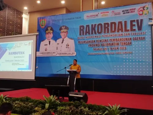 Palangka Raya. Kaltengtimes.co.id — Wakil Gubernur Kalimantan Tengah H. Edy Pratowo membuka secara resmi Rapat Koordinasi Pengendalian dan Evaluasi (Rakordalev) Pelaksanaan Rencana Pembangunan Daerah Provinsi Kalimantan Tengah (Prov. Kalteng) Triwulan I Tahun 2025., bertempat di Ballroom M. Bahalap Hotel Palangka Raya, Kamis (15/5/2025). Kegiatan tersebut dimaksudkan untuk mengevaluasi pelaksanaan pembangunan Kalimantan Tengah pada Triwulan 1 Tahun 2025, dengan melihat tingkat kesesuaian capaian kinerja dengan target indikator dalam RKPD 2025.