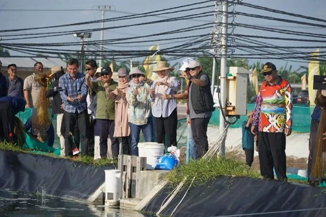 Asisten Perekonomian dan Pembangunan Setda Prov. Kalteng Herson B. Aden saat memimpin peninjauan Shrimp Estate di Desa Sei Raja Kabupaten Sukamara, Sabtu (7/6/2025), sekaligus melakukan panen berharap agar program kawasan udang vaname lebih dapat dikembangkan maksimal, untuk meningkatkan PAD.