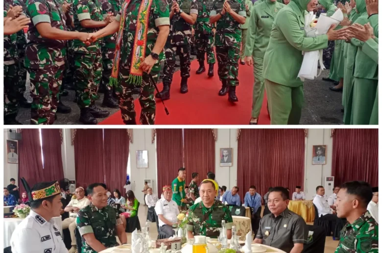 Kedatangan Mayjen TNI Jamallulael bersama Ketua Persit KCK Daerah XII Tanjungpura Ny. Indah Jamallulael di Makodim 1011 klk disambut dengan acara adat Tetek Pantan dan Tari Penyambutan. *(Nas)