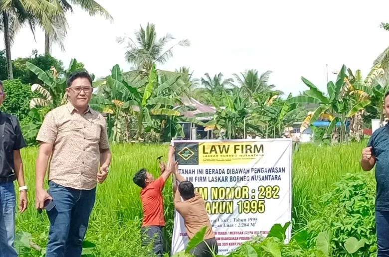 Kuala Kapuas, kaltengtimes.co.id – Law Firm Laskar Borneo Nusantara yang berkantor pusat di Banjarbaru, Kalimantan Selatan, mendampingi kliennya Iga Akbar dalam pemasangan plang hak milik di beberapa bidang tanah yang berada di Jalan Kesturi, Jalan Patih Rumbih, dan Jalan Baru bawah Jembatan Pulau Telo, Kuala Kapuas, pada Kamis (31/7/2025).