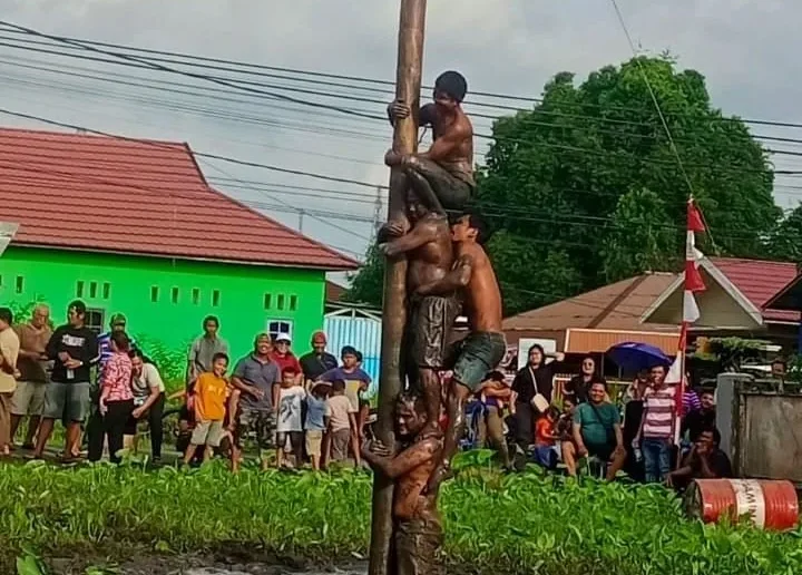 Lomba panjat pinang digelar pada Minggu (17/8/2025) sore di sekitar Sekretariat KKBB, Jalan Pilau. Sebanyak empat tim, masing-masing beranggotakan lima orang, berlaga menaklukkan batang pinang setinggi lima meter yang sudah dilumuri gemuk dan oli. Setelah berlangsung sekitar empat jam penuh sorak sorai penonton, akhirnya salah satu tim berhasil mencapai puncak.