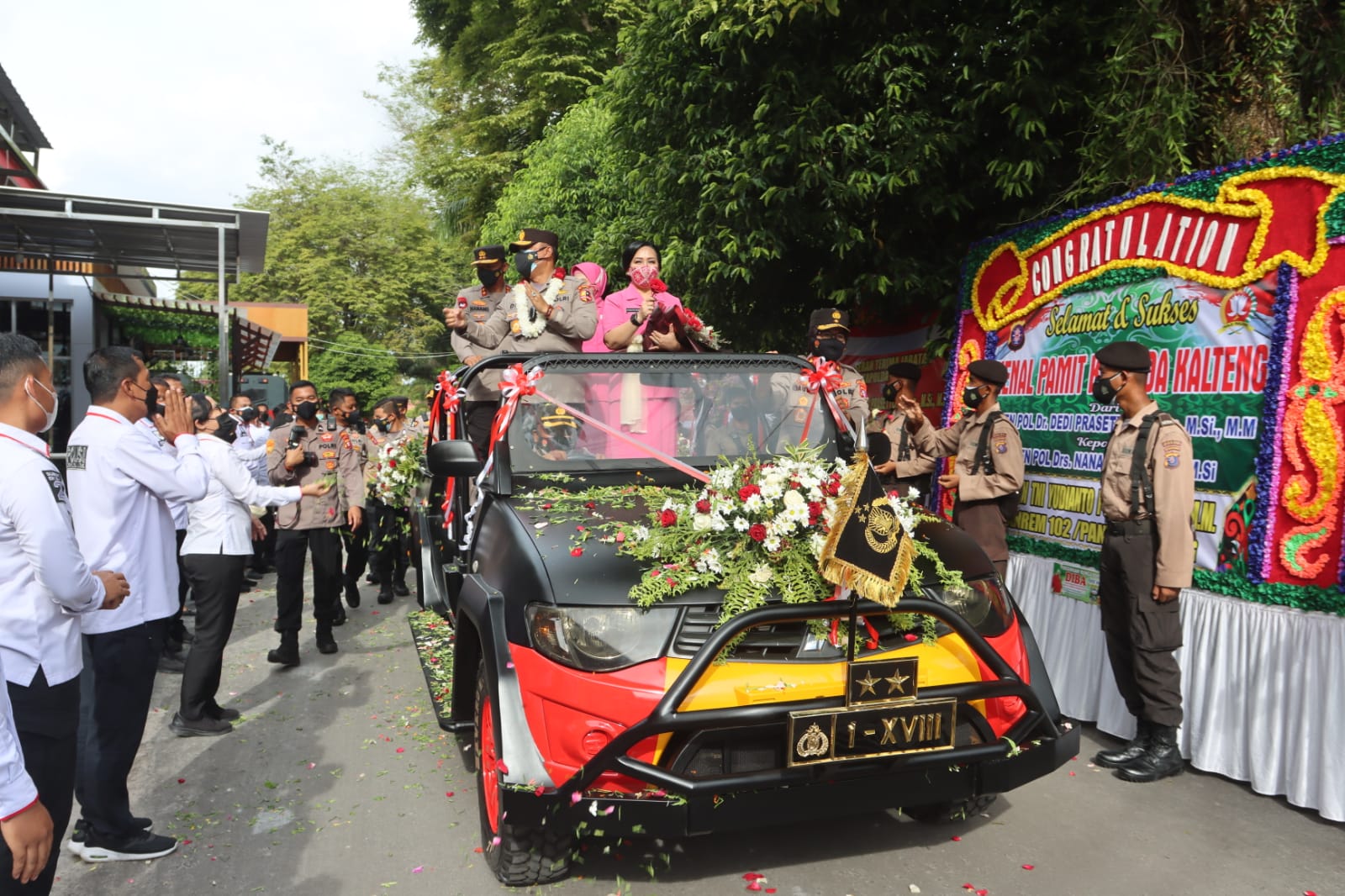Acara pelepasan diawali dengan prosesi pengalungan bunga dan Tradisi tarian adat istiadat Dayak. Serta pelepasan dilanjutkan dengan acara kedinasan pedang pora dan iring iringan penghormatan dari seluruh personel Polda Kalteng.