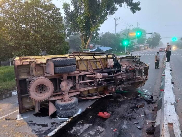 Palangka Raya, kaltengtimes.co.id – Sebuah truk yang melaju kencang dari arah Tangkiling menuju Palangka Raya tersebut menabrak median jalan (road barrier) di Jalan Tjilik Riwut Km. 7 dekat traffic light simpang Jalan Hiu Putih Palangka Raya, Selasa (14/12) dini hari.