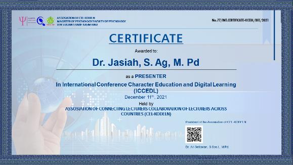Palangka Raya, kaltengtimes.co.id–Dr Jasiah S.Ag, M.Pd berhasil menjadi delegasi Dosen IAIN Palangka Raya pada “International Character Education and Digital Learning (ICCEDL 2021)”.