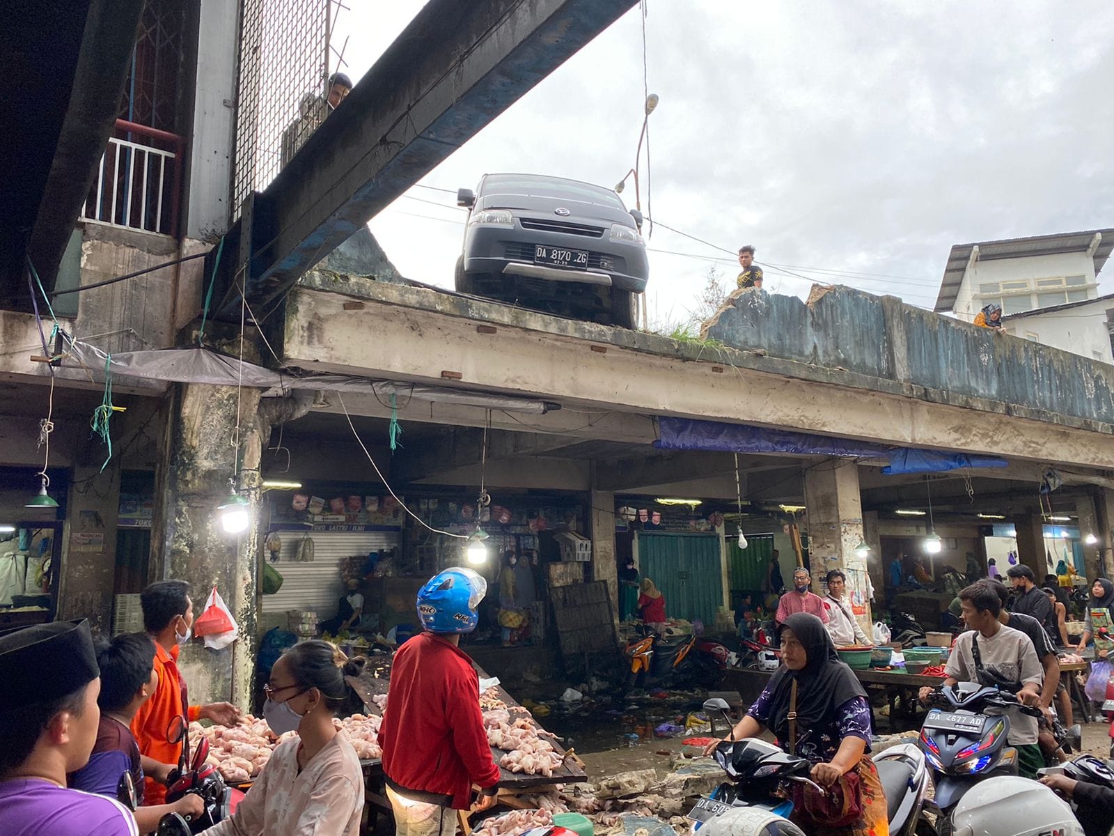 “Sekitar Pukul 04.30 Wita menabrak pagar di lantai 2 pembatas dari parkiran atas Pasar Antasari yang membuat dinding pembatas jebol,” ungkap salah seorang saksi.