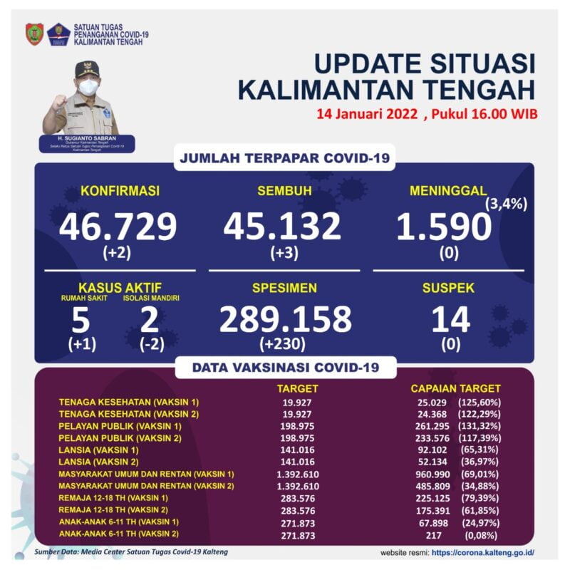 PALANGKA RAYA. Kaltengtimes.co.id – Berdasarkan laporan data akumulasi yang dihimpun Tim Satuan Tugas Penanganan Covid-19 Kalimantan Tengah, bahwa pada hari Jum’at, Tanggal 14 Januari 2022, Pukul 15.00 Waktu Indonesia Barat, kasus konfirmasi positif di Kalimantan Tengah kembali bertambah 2 orang, yakni terjadi di Kabupaten Lamandau 1 orang dan Kabupaten Seruyan 1 orang. Dengan bertambahnya 2 orang kasus konfirmasi positif tersebut, jumlah nya dari semula 46.129 orang bertambah menjadi 46.729 orang.