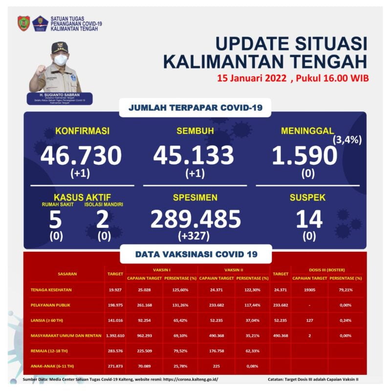 Terkait perkembangan data Covid-19 yang dihimpun akumulasinya pada hari Minggu Tanggal 15 Januari 2022, Pukul 15.00 WIB, kasus konfirmasi positif di kalimantan Tengah ada penambahan sebanyak 1 orang, yaitu di Kabupaten Sukamara, sehingga dari semula sebanyak 46.729 orang menjadi 46.730 orang. Pasien sembuh ada penambahan sebanyak 1 orang, yaitu di Kabupaten Kapuas, sehingga dari semula 45.132 orang menjadi 45.133 orang. Sedangkan pasien dalam perawatan tidak ada penambahan, sehingga tetap menjadi 7 orang. Untuk kasus meninggal tidak ada penambahan, sehingga tetap menjadi 1.590 orang dengan tingkat kematiannya (CFR) 3,4 %. (red)