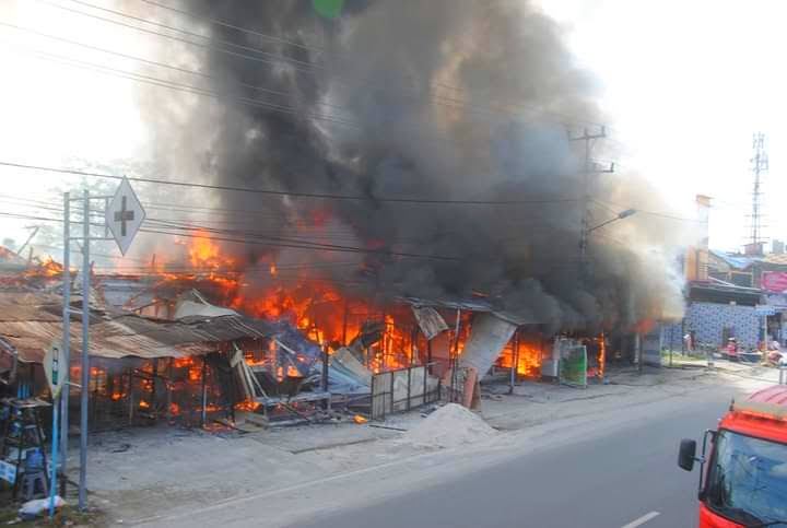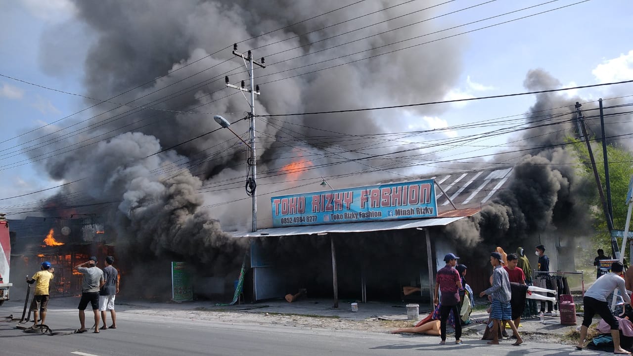 Kobaran api diketahui mulai menyambar bangunan ruko di bagian depan, sekitar ada 9 ruko yang terbakar, kejadian pukul 14.39 WIB.