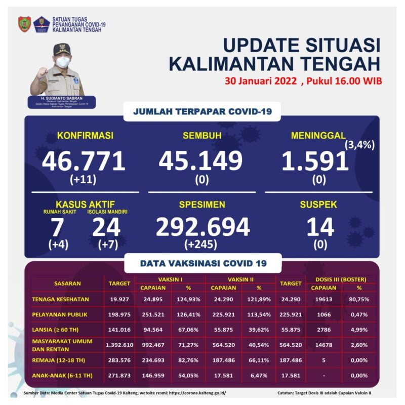 Tim Satuan Tugas Penanganan Covid-19 Kalimantan Tengah menyampaikan melalui Press Release nya untuk pasien sembuh tidak ada penambahan, sehingga jumlahnya tetap 45.149, pasien dalam perawatan ada penambahan sebanyak 11 orang, sehingga dari semula 20 orang menjadi 31 orang. Sedangkan kasus meninggal dilaporkan tidak ada penambahan, sehingga tetap menjadi 1.591 orang dengan tingkat kematian (CFR) 3,4 persen.