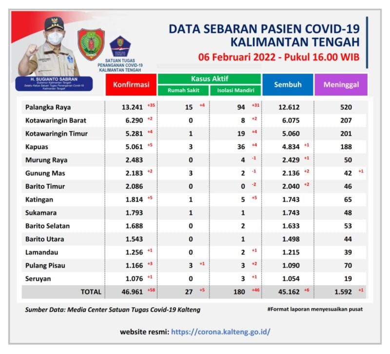 PALANGKA RAYA. Kaltengtimes.co.id — Masyarakat diminta harus benar-benar waspada. Hari Minggu, Tanggal 6 februari 2022, Pukul 16.00 Waktu Indonesia Barat, kasus konfirmasi positif Covid-19 di Wilayah Kalimantan Tengah kembali bertambah 58 orang, 1 orang pasien diantaranya meninggal dunia.